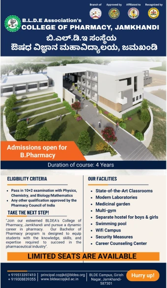 BLDEA s College of Pharmacy is established in 2023 in the pleasant environs of commerce, BHS Arts and TGP Science college , Jamkhandi, with the aim of providing quality education in Pharmaceutical Sciences. The courses started with, B. Pharm in 2023